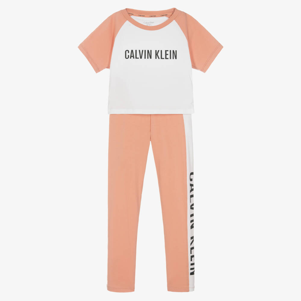 Girls pink cotton jersey pyjamas by Calvin Klein. Soft and stretchy, the top has contrast white panels and a logo print across the chest. The matching trousers are full length and have an elasticated waistband.