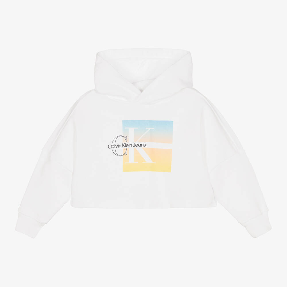 White cropped hoodie for girls by Calvin Klein, made in soft cotton jersey. Comfortable and casual, it has a relaxed dropped shoulder fit and ribbed cuffs. The front of the hoodie features a gradient logo print of the iconic CK monogram motif, adding unmistakable designer style.