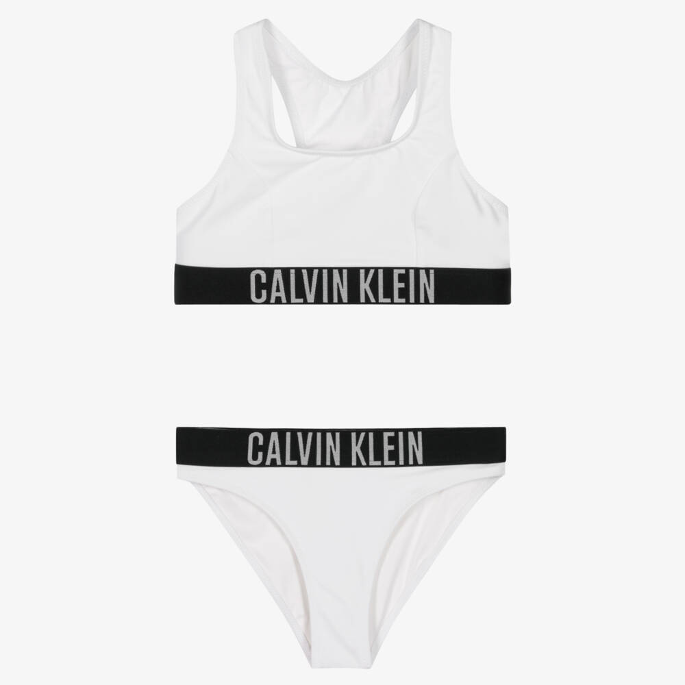 Sporty white bikini for older girls by Calvin Klein. The matching set has elasticated logo jacquard trims in black and silver and the top has a stylish racer back. Silky smooth and stretchy, it is made with recycled fibres and both pieces are lined at the front for comfort.