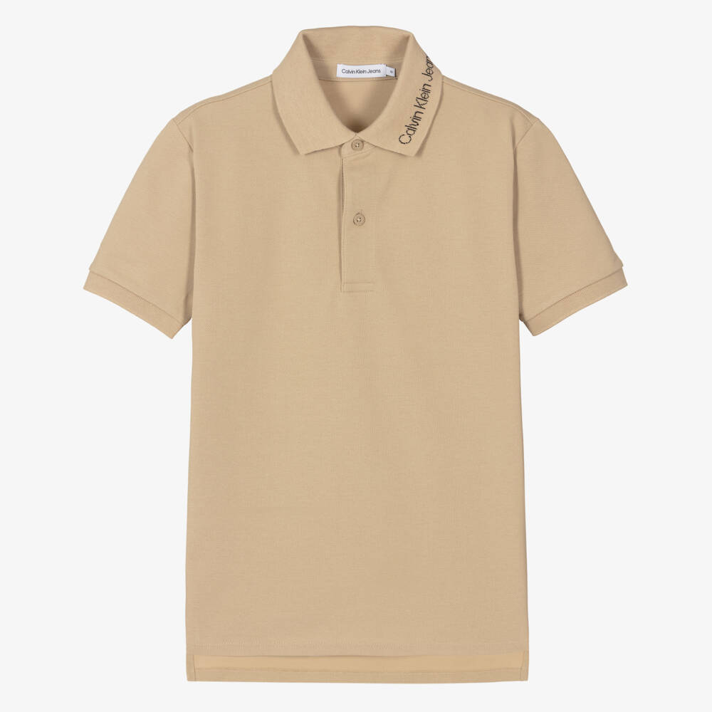 Beige polo shirt for teen boys by American brand Calvin Klein, distinctively designed with black logo lettering on the collar. Made from soft and stretchy piqué, this timeless style has lightly ribbed trims and branded button fastenings on the front.