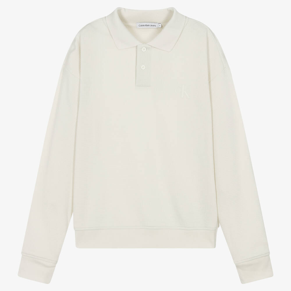 Casual ivory polo shirt for teen boys by American brand Calvin Klein, subtly branded with a rubberised CK monogram logo on the chest. This cool hybrid design combines a classic polo collar and button fastenings, with a boxy shape, dropped shoulders and sweatshirt style trims for a cosy and laid-back styling. This long-sleeved top is made in soft cotton jersey mesh for comfort.