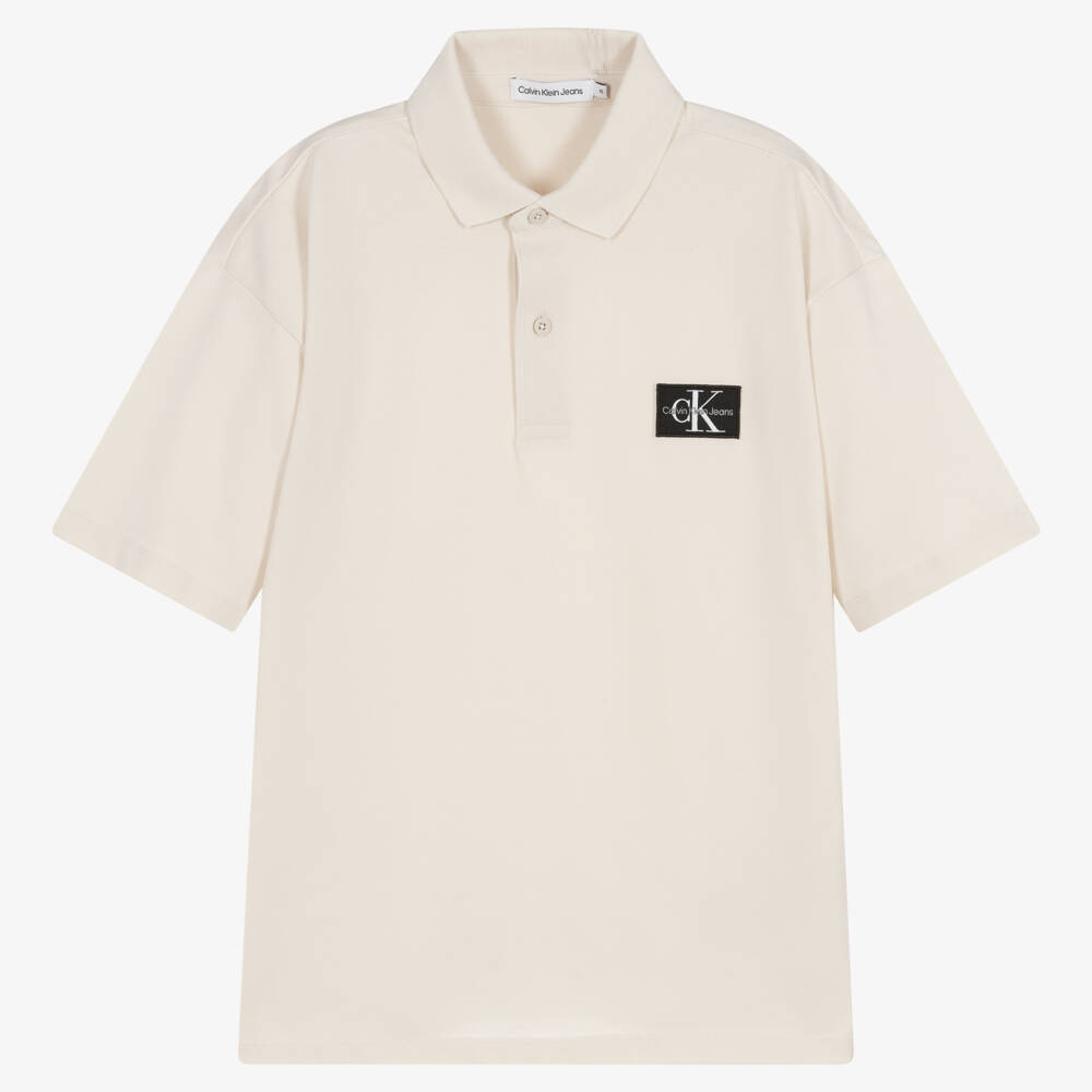Beige-ivory polo shirt for teen boys by Calvin Klein, with a signature CK monogram badge on the chest. Cool and comfortable, this casual style is made in soft cotton piqué, with a split hem. It has a ribbed collar and fastens with branded buttons on the front.