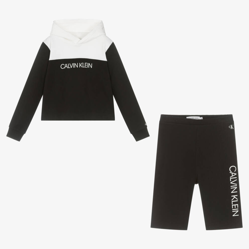 Great for sports or loungewear, this black and white hoodie and cycle shorts set for teen girls is by Calvin Klein Jeans. Both the mid-weight hoodie and the lightweight shorts are made in soft cotton jersey and have white logo prints. The shorts have a comfortable elasticated waist for a good fit.
