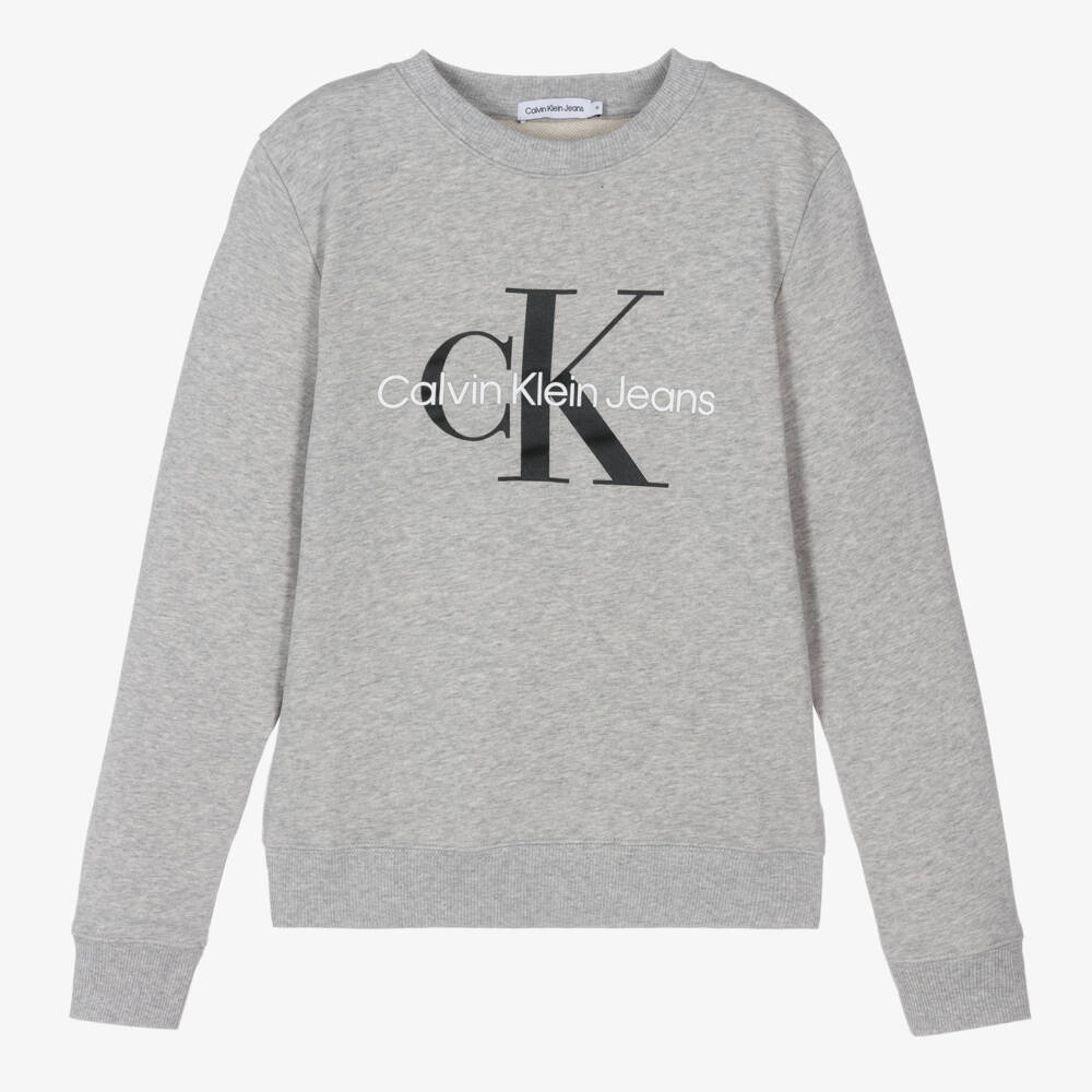 Grey marl cotton sweatshirt for teen boys and girls by Calvin Klein Jeans, with a black and white monogram logo print on the front. Instantly recognisable, this casual, jersey top has ribbed trims for comfortable wear.