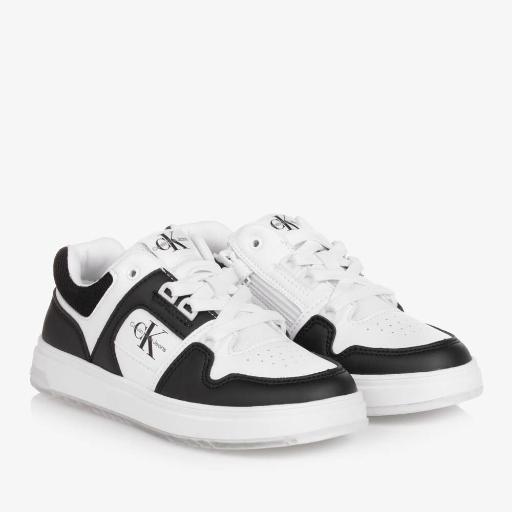 Cool black and white trainers for teen boys and girls by Calvin Klein, branded with CK monogram logos. Fastening with laces, they have a zip and velcro on the side for easy on-and-off. Using recycled material, they are made in smooth faux leather with soft mesh trims. There is a soft fabric lining and a non-slip rubber sole. This product was made from at least 50% recycled polyester.