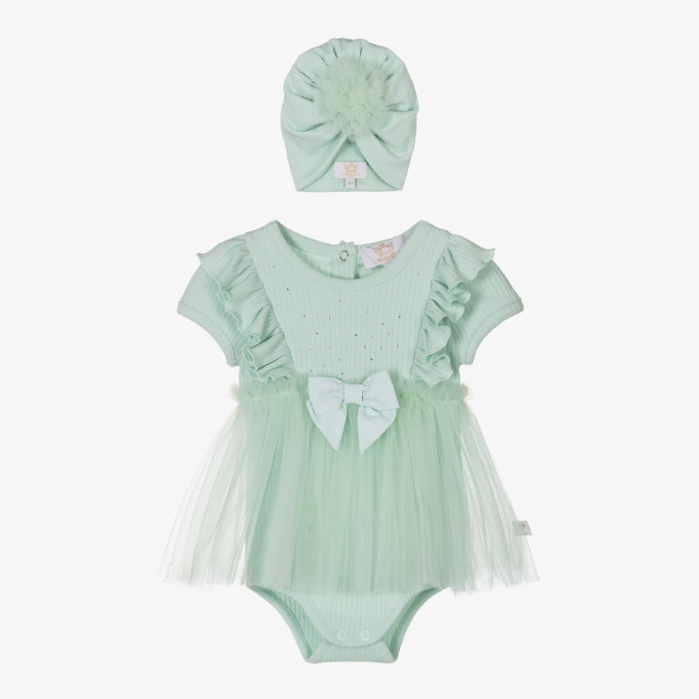 Adorable green dress set for baby girls by Caramelo Kids, made from soft ribbed cotton jersey. Sweet and charming, the dress has over-the-shoulder ruffles, sparkly diamanté embellishments, a pretty bow detail and a lovely gathered tulle tutu skirt. There are practical popper fastenings on the back and between the legs of the attached knickers for easy dressing. The cute, turban-style hat has a coordinating tulle flower on the front.