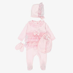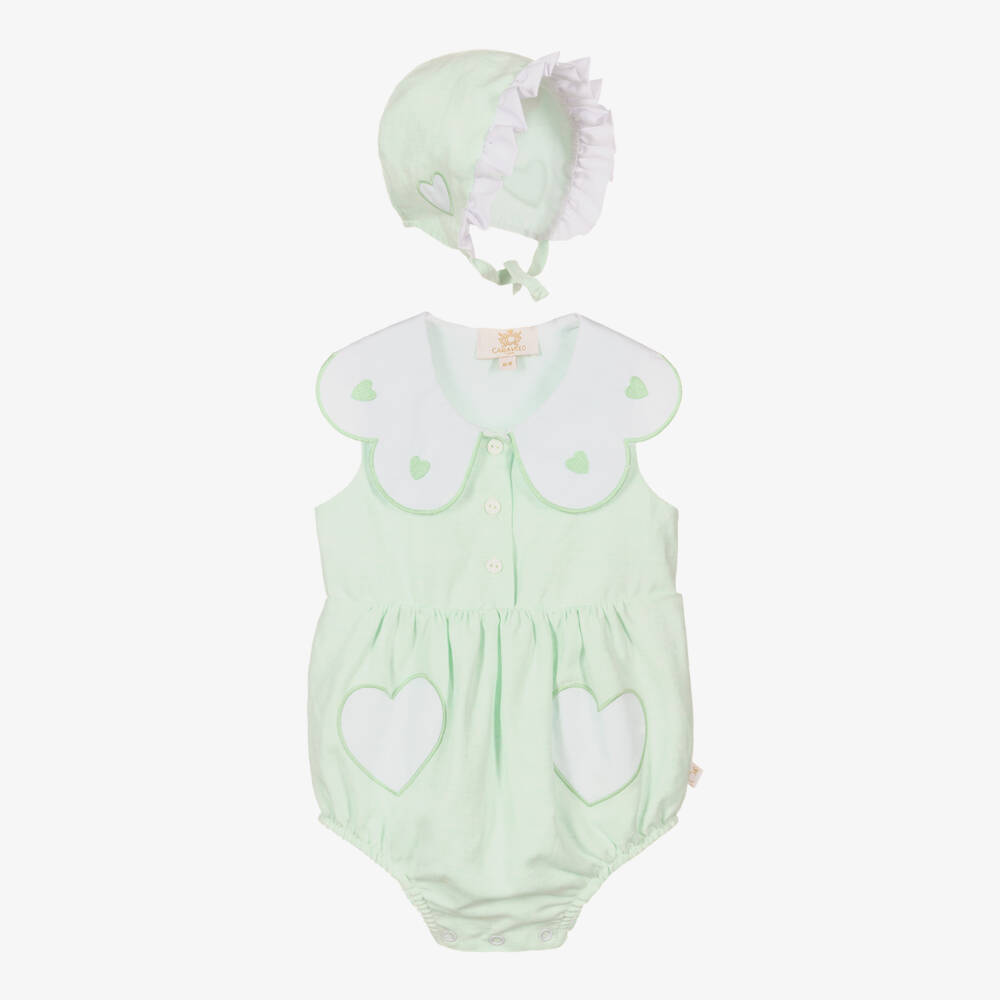 In mint green and white, a charming shortie and bonnet set for baby girls by British brand Caramelo Kids. Both pieces are woven in a soft linen and cotton blend, with a lightweight lining for extra comfort. The shortie has a lovely scalloped collar and sweet heart detailing. It fastens with buttons at the top and with poppers between the legs. The coordinating bonnet has a pretty ruffle trim and secures with ties under the chin.
