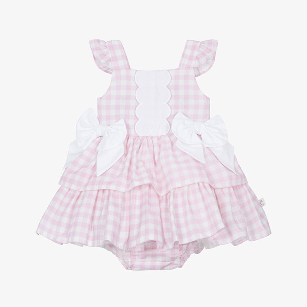 Pink and white gingham checked dress for baby girls by Caramelo Kids, made in soft cotton. This cute dress has ruffled short sleeves and a shirred back for a good fit. It is fully lined and the tiered skirt has tulle layers for added volume. There are fixed white bows and trims on the front for a pretty finish and it comes with a matching pair of knickers.