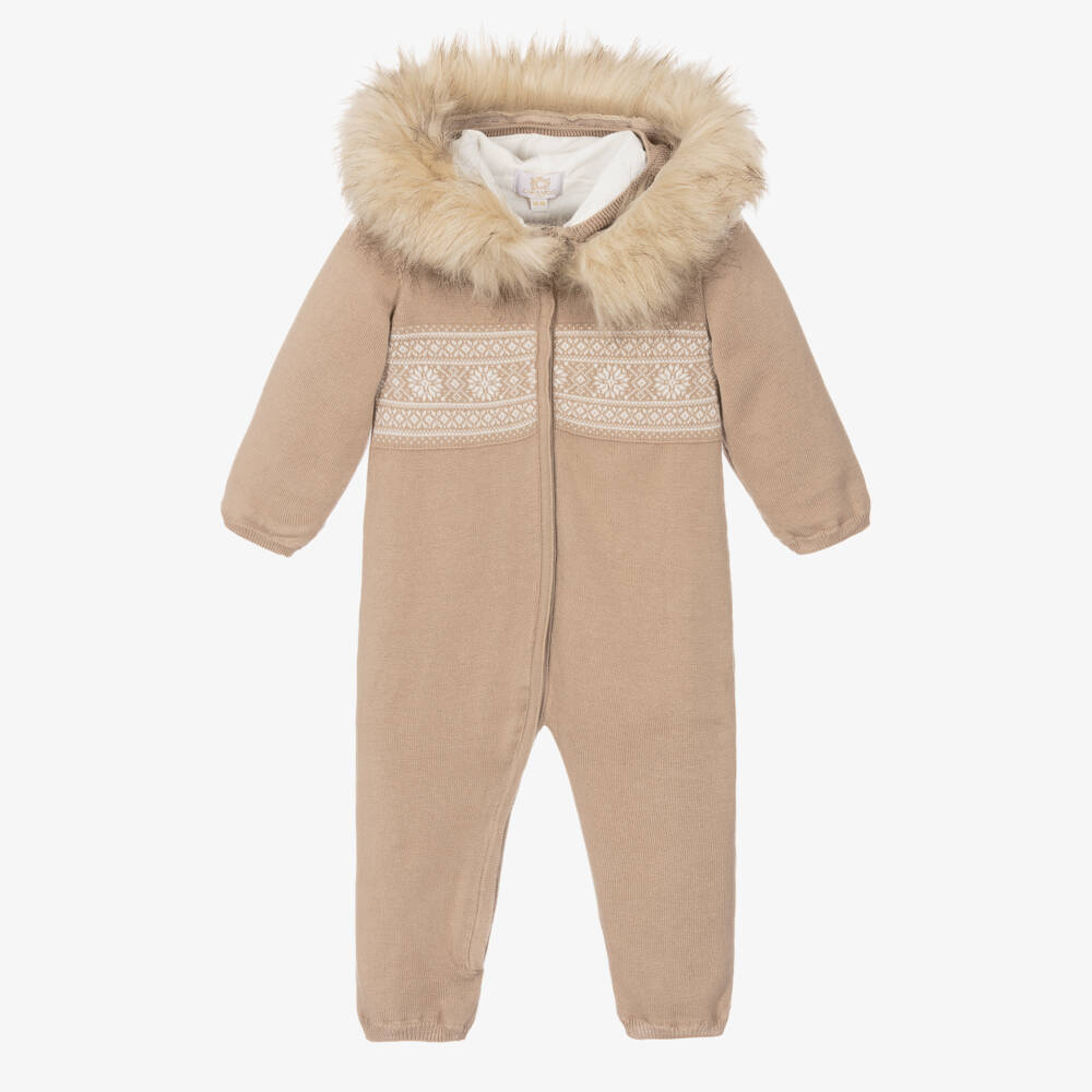 Cosy beige pramsuit for baby boys and girls by Caramelo Kids, knitted in beautifully soft cotton. Lined in jersey for warmth, this lovely pramsuit has a sweet Fair Isle pattern across the chest in white. It fastens easily at the front with a zip and has a hood with a beautifully soft faux fur trim, which attaches with buttons for an alternative look.