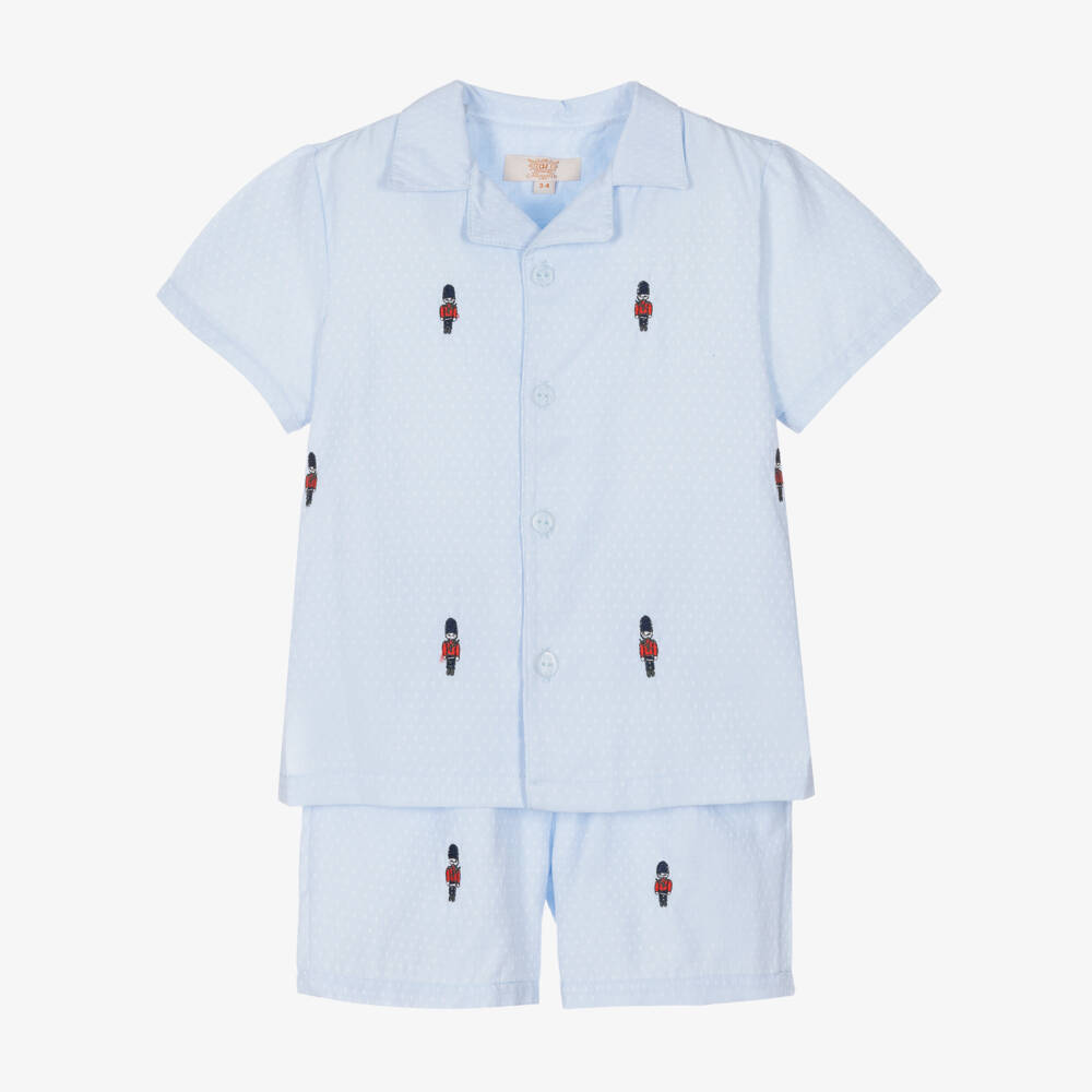 Boys pale blue cotton pyjamas by Caramelo Kids, with red and blue soldier embroidery. Soft and lightweight, these classically styled shorts pyjamas have a small revere collar and comfortable elasticated waist.