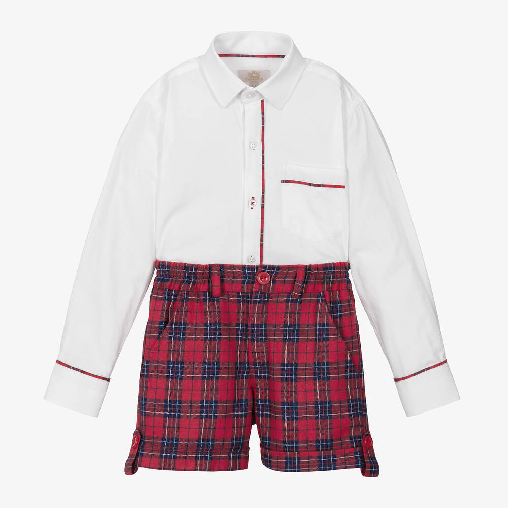 طقم شورت تارتان قطن لون أحمر وأبيض للأولاد