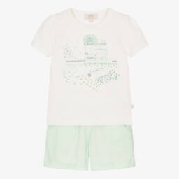 White and blue cotton shorts set for boys by Caramelo Kids. Made in soft piqué, the T-shirt has a lightly ribbed neckline and a pale blue logo embroidered on the chest. Completing the casual look, the comfortable jersey shorts have useful pockets and a drawstring waistband for an ideal fit.