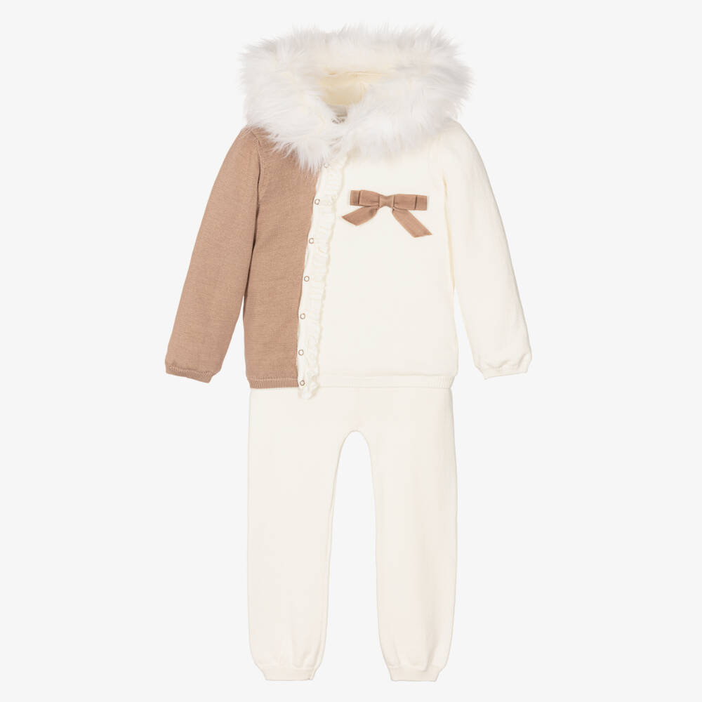 Ivory and beige trousers set for little girls by Caramelo Kids, knitted in the softest cotton. Lovely for eye-catching styling, the hooded top has a removable button-on faux fur trim and a ruffled popper fastening placket. A dark beige bow decorates the chest and matching trousers complete this cute, coordinated look.