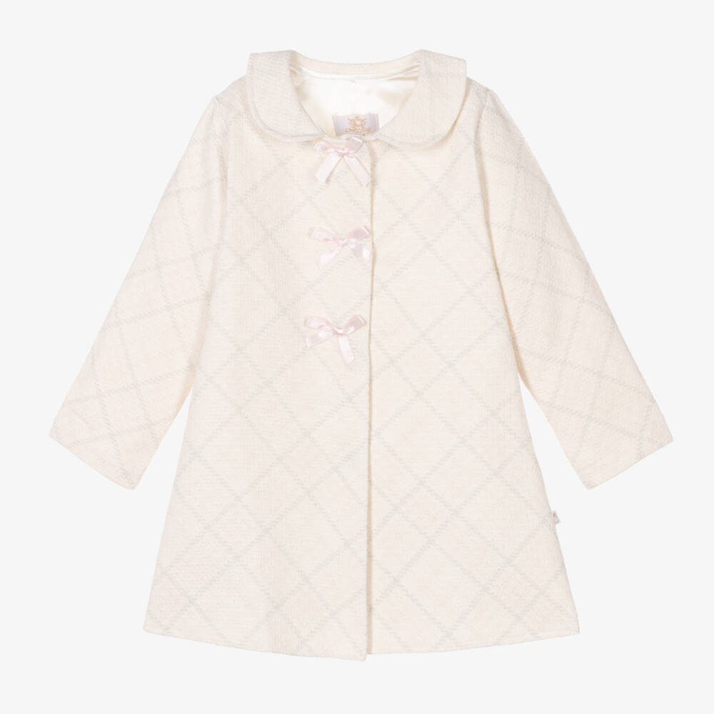 Lovely ivory coat for girls by British brand Caramelo Kids, made in soft, lightweight tweed. This classically styled coat has a pink and grey check pattern and a rounded collar. It is lined in soft satin and has concealed popper fastenings on the front with pink bow trims.
