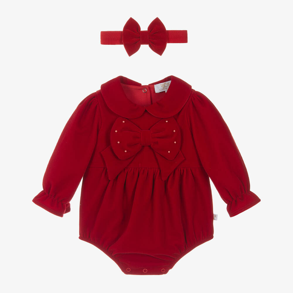 A charming red babysuit set for girls by Caramelo Kids. Made from soft velvet with a lightweight woven lining, the shortie has a delightful Peter Pan collar and a statement pearl-embellished bow decoration on the chest. It fastens with poppers on the back and between the legs to help with dressing. A coordinating bow headband completes the look.