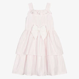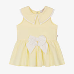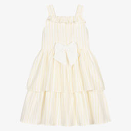 A beautiful pastel yellow dress for girls by Caramelo Kids. Designed with a classic empire bodice and a flared skirt, it has gorgeous ruffled sleeves, a centre bow and a white trim. It is made in a soft linen and cotton blend in a subtle herringbone weave, with a lightweight lining and a keyhole button fastening.
