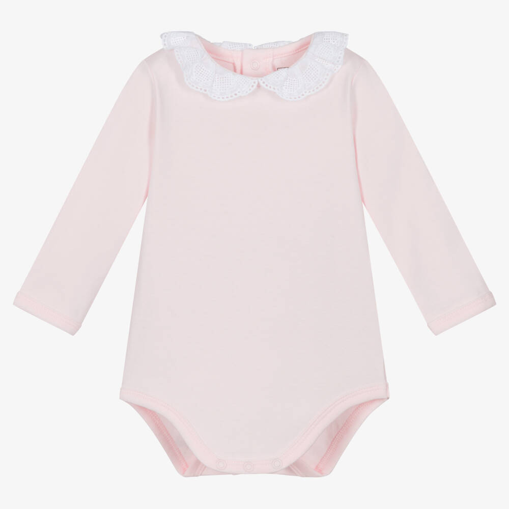 A pale pink bodysuit for baby girls by Carrément Beau, made from soft organic cotton jersey. Sweet and simple, this long-sleeved bodysuit has a white embroidered lace Peter Pan collar and fastens with poppers on the front and between the legs.