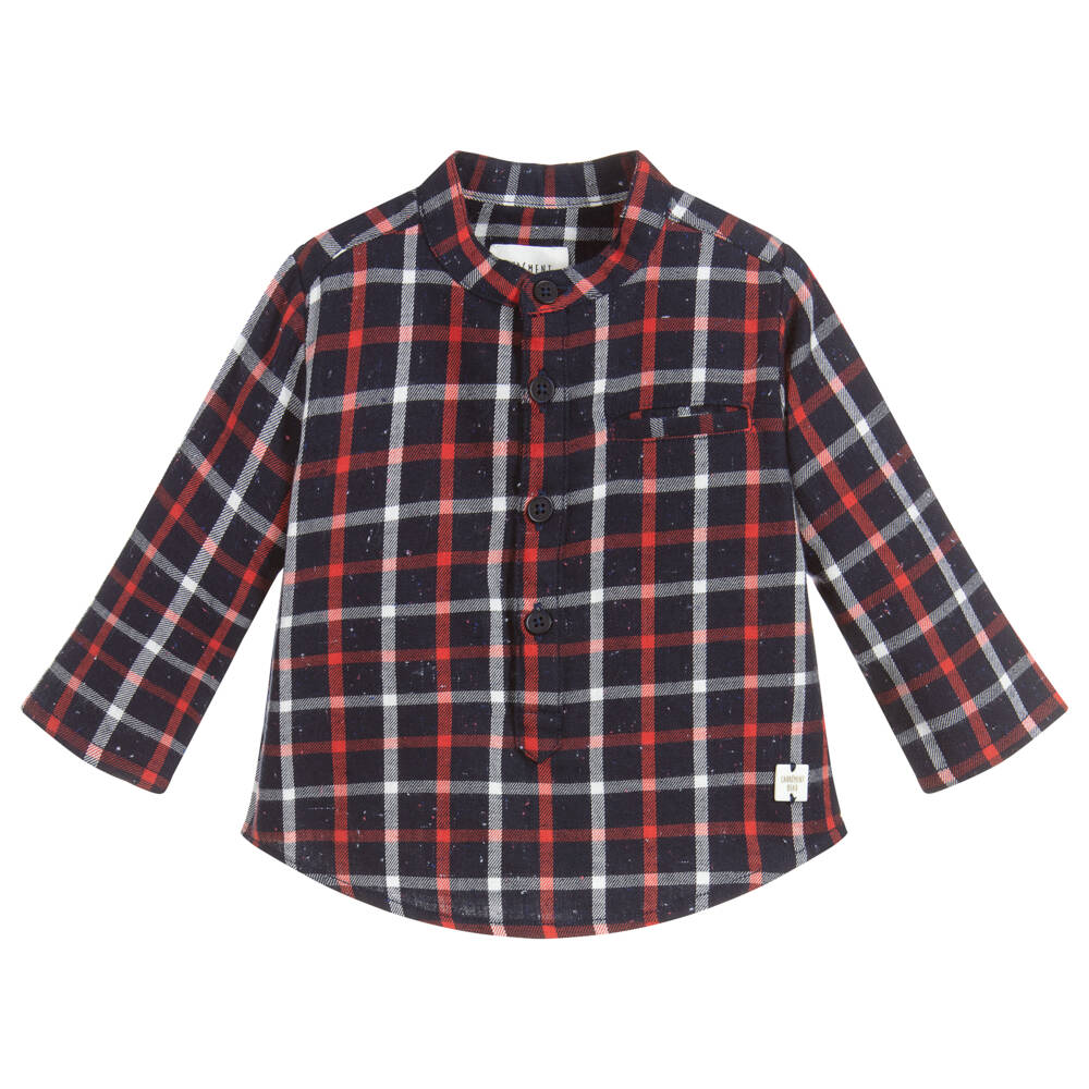 Little boys navy blue and red check shirt by Carrément Beau. Made in soft brushed cotton with a mandarin collar and branded button fastenings on the front.