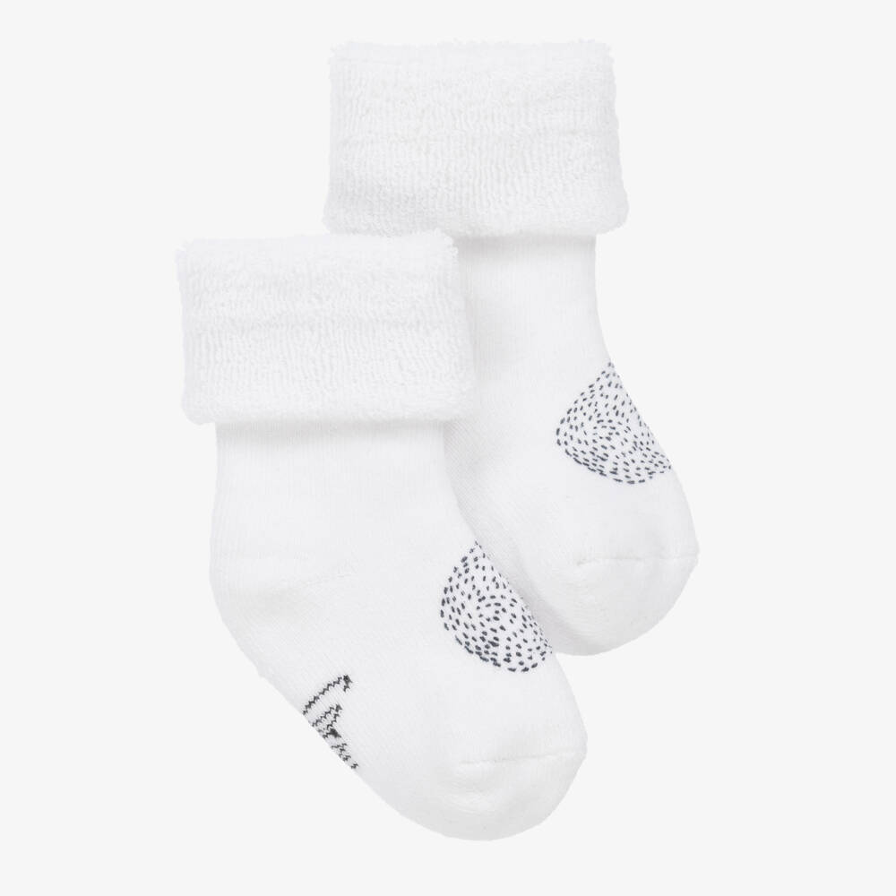 White socks for little boys by Carrément Beau, knitted in soft and stretchy cotton with a fluffy towelling inside. Patterned with a sweet baby bear in subtle black print, they have a logo print on the soles.