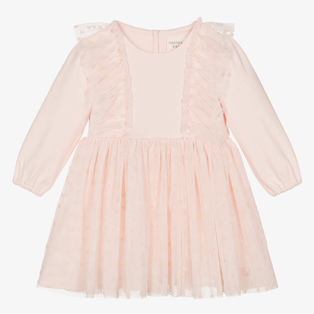 A pale pink dress for little girls by French brand Carrément Beau. It has a beautifully soft cotton jersey bodice and puff sleeves, with glittery ruffled tulle trims patterned in love hearts. There are rose gold button fastenings on the back and a lightweight cotton lining.