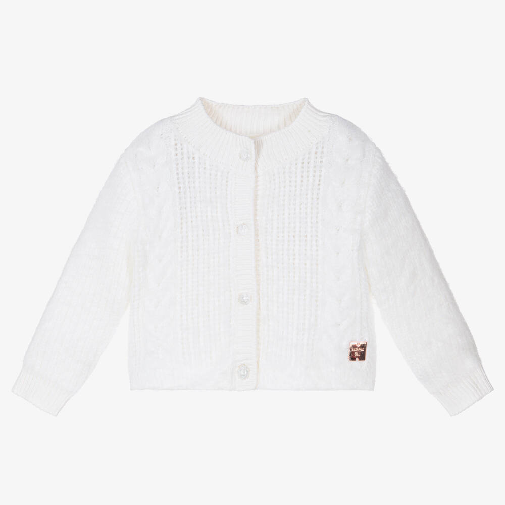 Gorgeous fluffy white cardigan for little girls by French brand Carrément Beau. Made in a beautiful soft knit, this elegant cardigan has ribbed cuffs and fastens at the front with sparkling silver glitter buttons. There is a rose gold branded metal plate sewn on the front hem for a finishing designer touch.