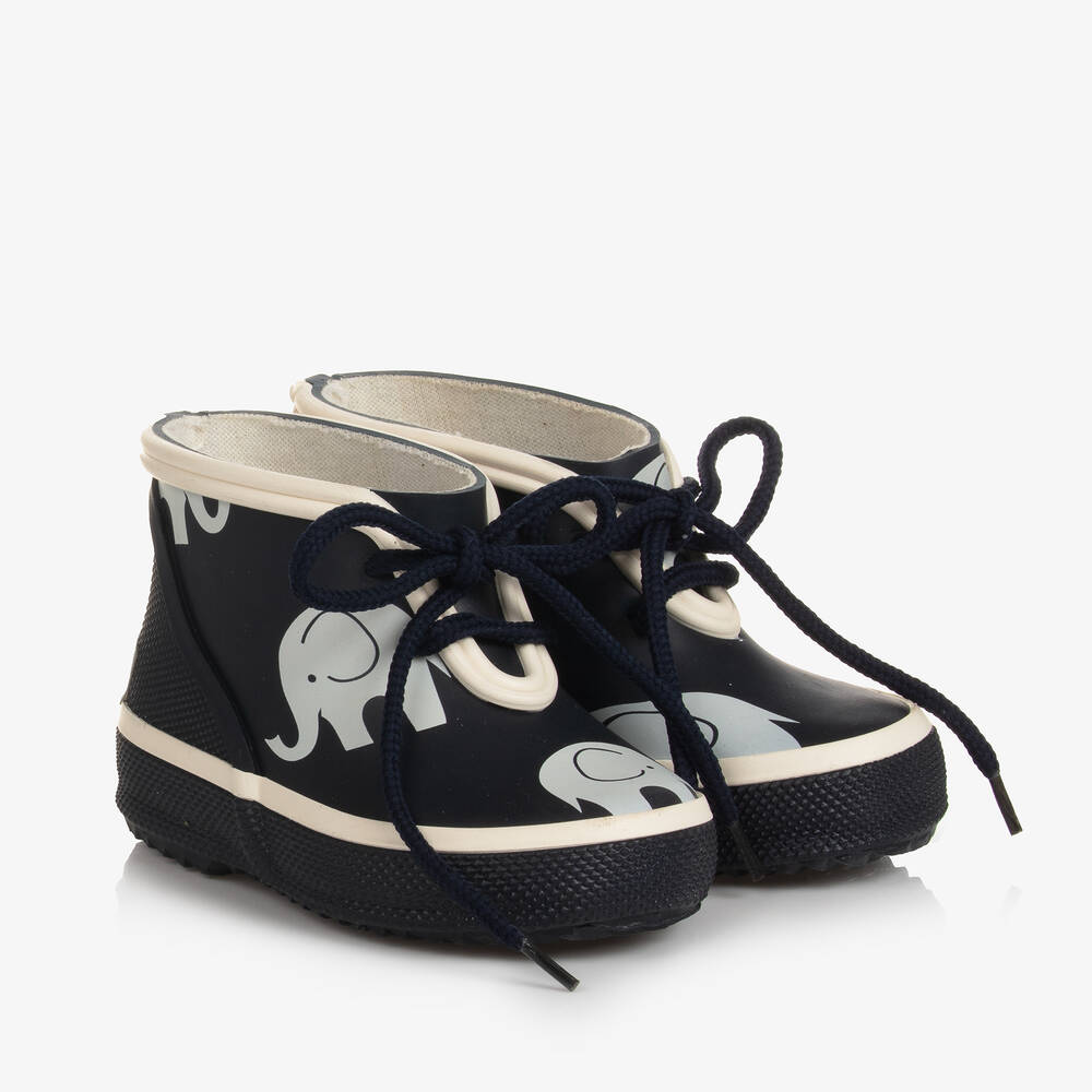A pair of navy blue rain boots for boys and girls from Danish brand CeLaVi. Made from soft natural rubber, they have a pale blue elephant pattern, with ivory trims and a lace-up front. There is a comfortable fabric lining, a ridged sole, and a reflective print on the heel for added safety.