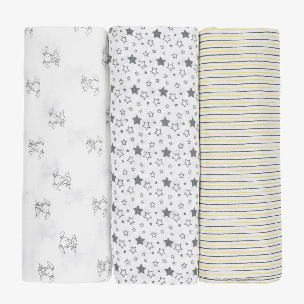 Versatile nursery accessories, these organic cotton swaddles for baby girls are by Childrensalon Essentials. Made in soft, lightweight and absorbent off-white muslin, one has an adorable grey bunny print, another a grey heart print, and the third is striped in yellow and grey. They can be used to wrap around young babies as swaddles, or for as a cover when breastfeeding and when out and about in the pram, car seat or stroller. The trio are presented in fully biodegradable packaging.