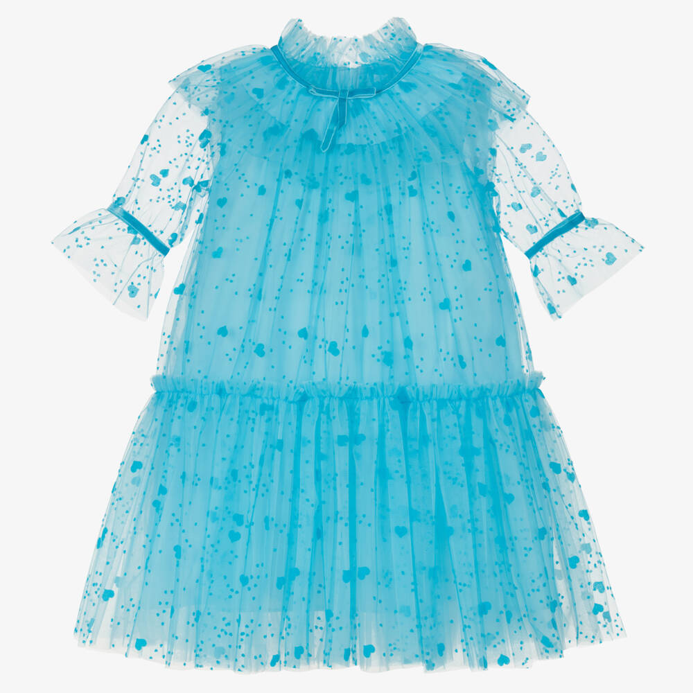 فستان تول لون أزرق بطبعة قلوب