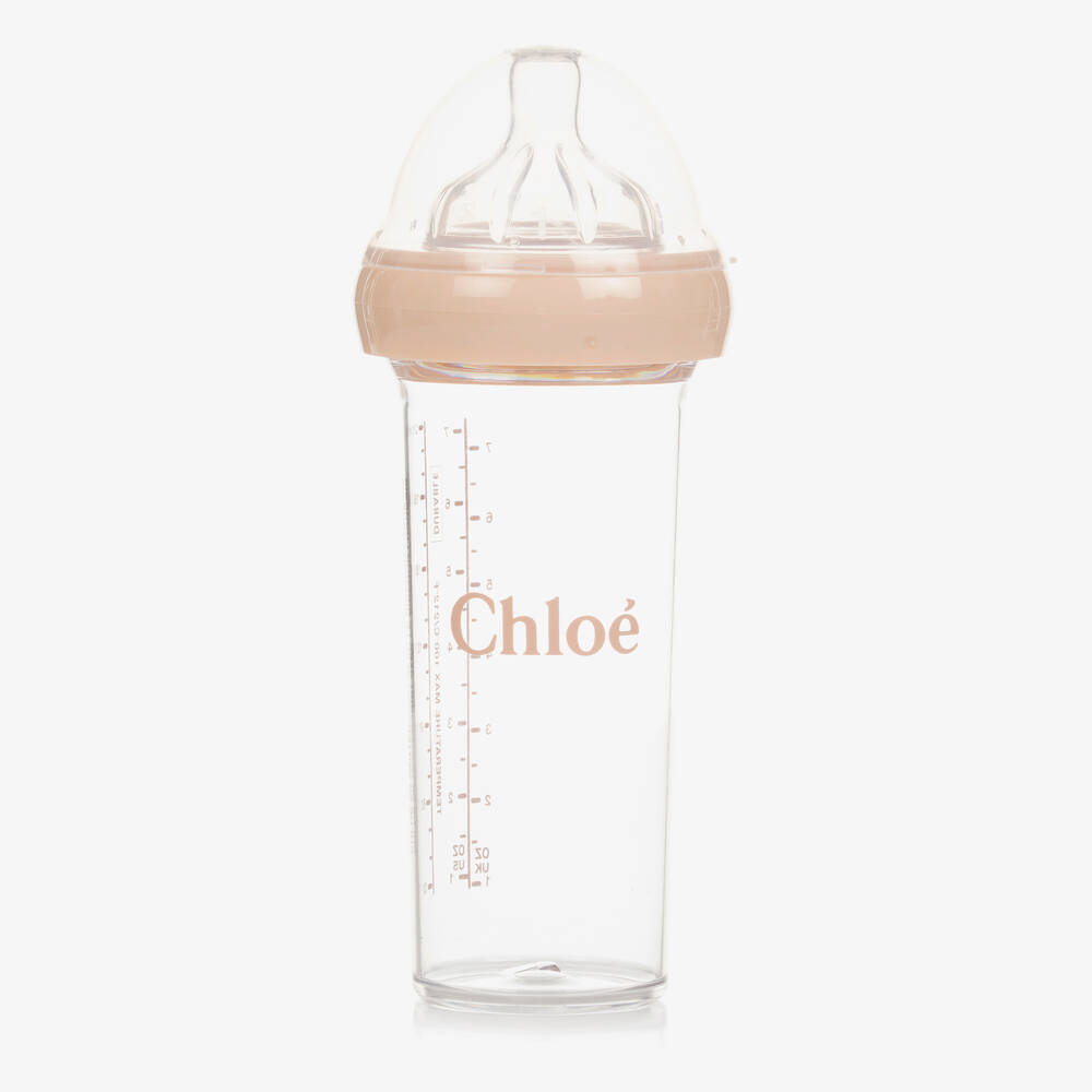 Pink anti-colic bottle for baby girls by luxury French brand Chloé. With a 210ml capacity, this feeding bottle has an anti-colic valve and a soft silicone teat with an anti-collapsing system. It is printed with the brand's logo and measurements for easy feeding. It comes with a handy cap and branded storage bag.