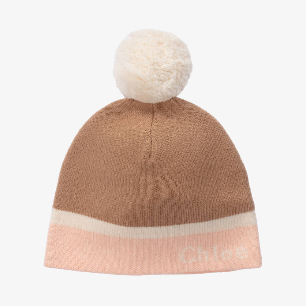 Beige organic cotton and wool hat from luxury label Chloé, made in a super-soft and cosy knit. Striped in ivory and pink, this lovely design is enhanced by an intarsia signature logo and a fluffy ivory pom-pom on the top.