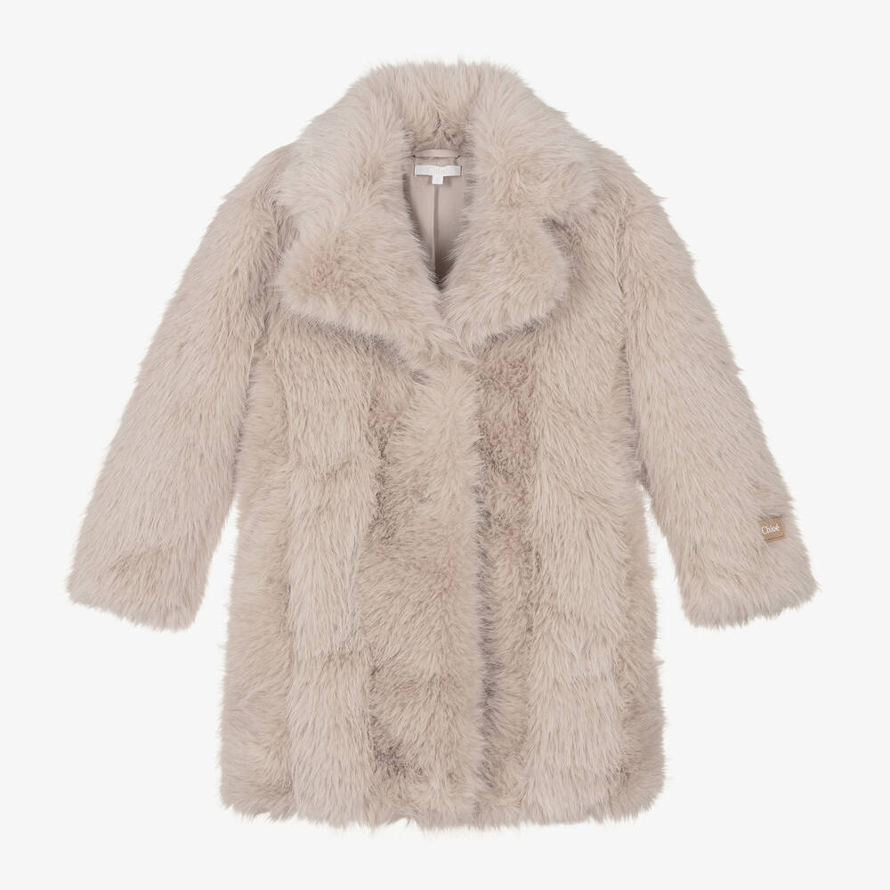 Stunning beige Mini-me coat for girls by luxury French designer, Chloé. Beautifully made in exquisitely soft faux fur, this statement coat keeps your child warm in style. From the oversized collar to the longer-length hem, it is chic, stylish and undeniably Chloé. There are faux tortoiseshell buttons on the front, a logo patch on one sleeve and a soft cotton twill lining. This product contains at least 80% recycled fibres.