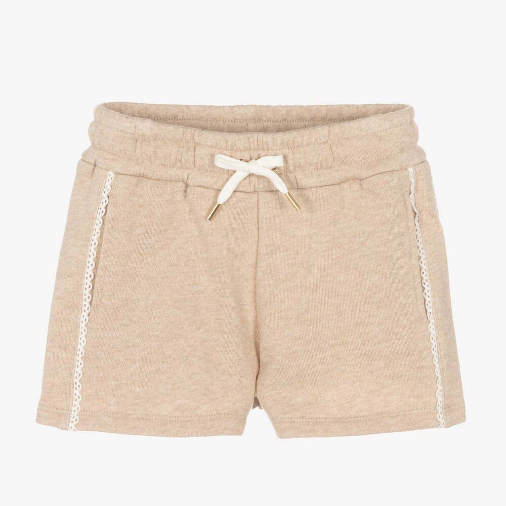 Beige jersey shorts for girls by French brand Chloé. They have pretty guipure lace trims on the sides and the Chloé signature logo embroidered in ivory on one side. Made in soft organic cotton sweatshirt jersey, they have pockets concealed on the side seams. For an adjustable fit, there is an ivory drawstring on the elasticated waist with branded gold tone hardware for an added luxury touch to this casual style.