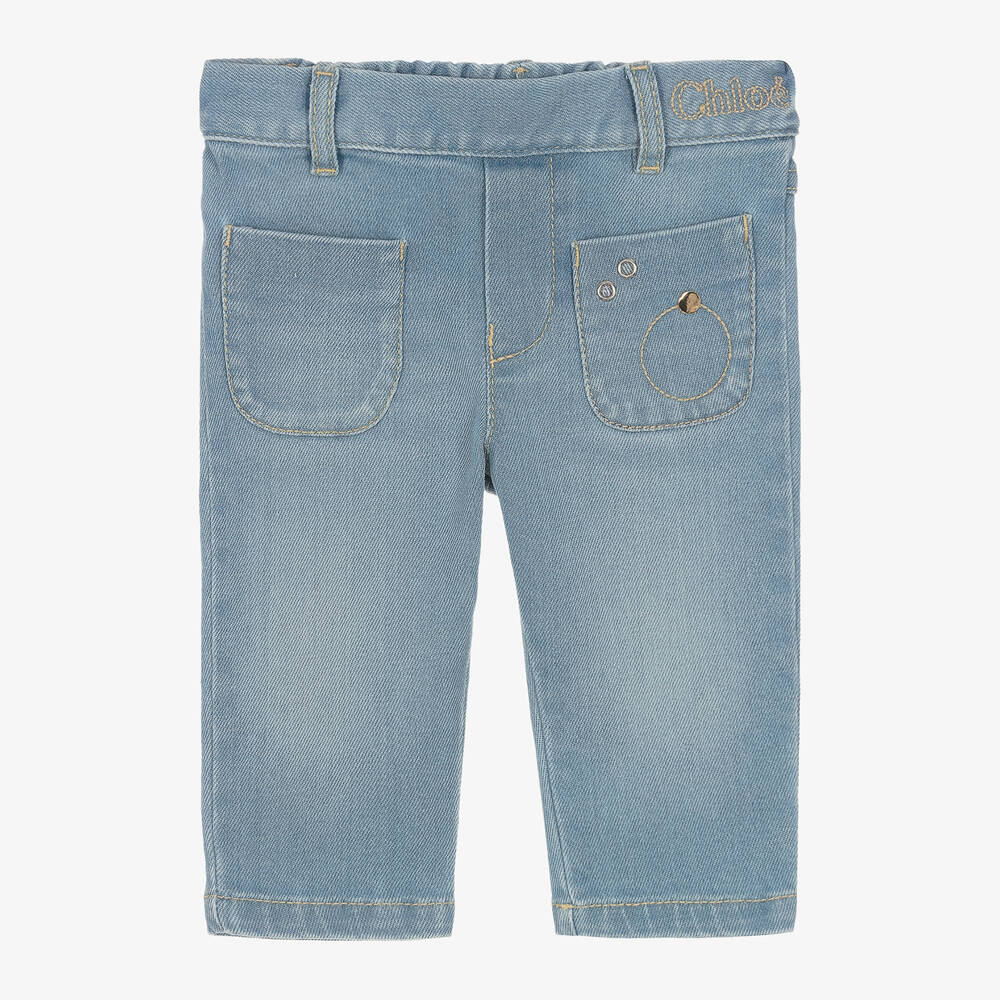 Mini-me, light blue wash jeans for little girls by luxury designer Chloé, made in soft cotton denim with a slight stretch for comfort. This comfortable style has an elasticated waist for easy pull-on, with an embroidered logo on the front to match the contrast pale yellow stitching. They have patch pockets on the front and back with embroidery, stud and metal eyelet detail on the front for a signature look.