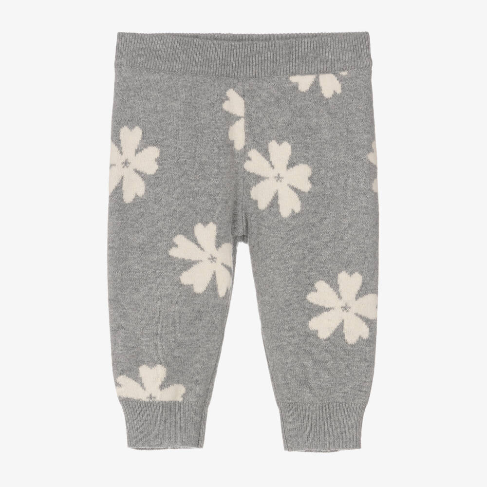 Grey leggings for little girls by luxury French brand Chloé, in a soft organic cotton and wool knit. It is patterned in the iconic ivory floral design, with a tonal motif embroidered on the back for a subtle designer look.