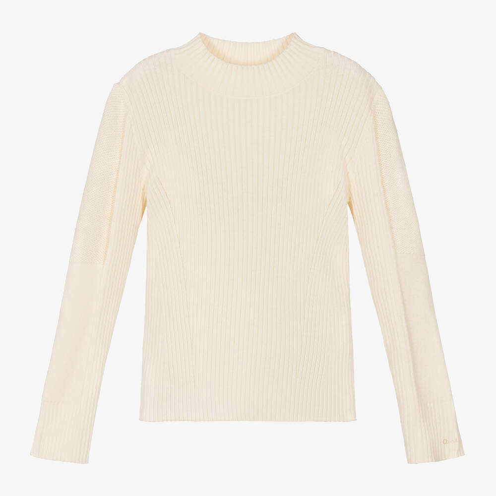 Ivory Mini-me sweater for girls by luxury label, Chloé. This simple, turtleneck top has contrasting knitted panels and a slim fit. Made in a beautifully soft organic cotton and wool blend for warmth and comfort, it has the designer's signature logo delicately embroidered on one of the cuffs, signing off the look with a subtle branded touch.