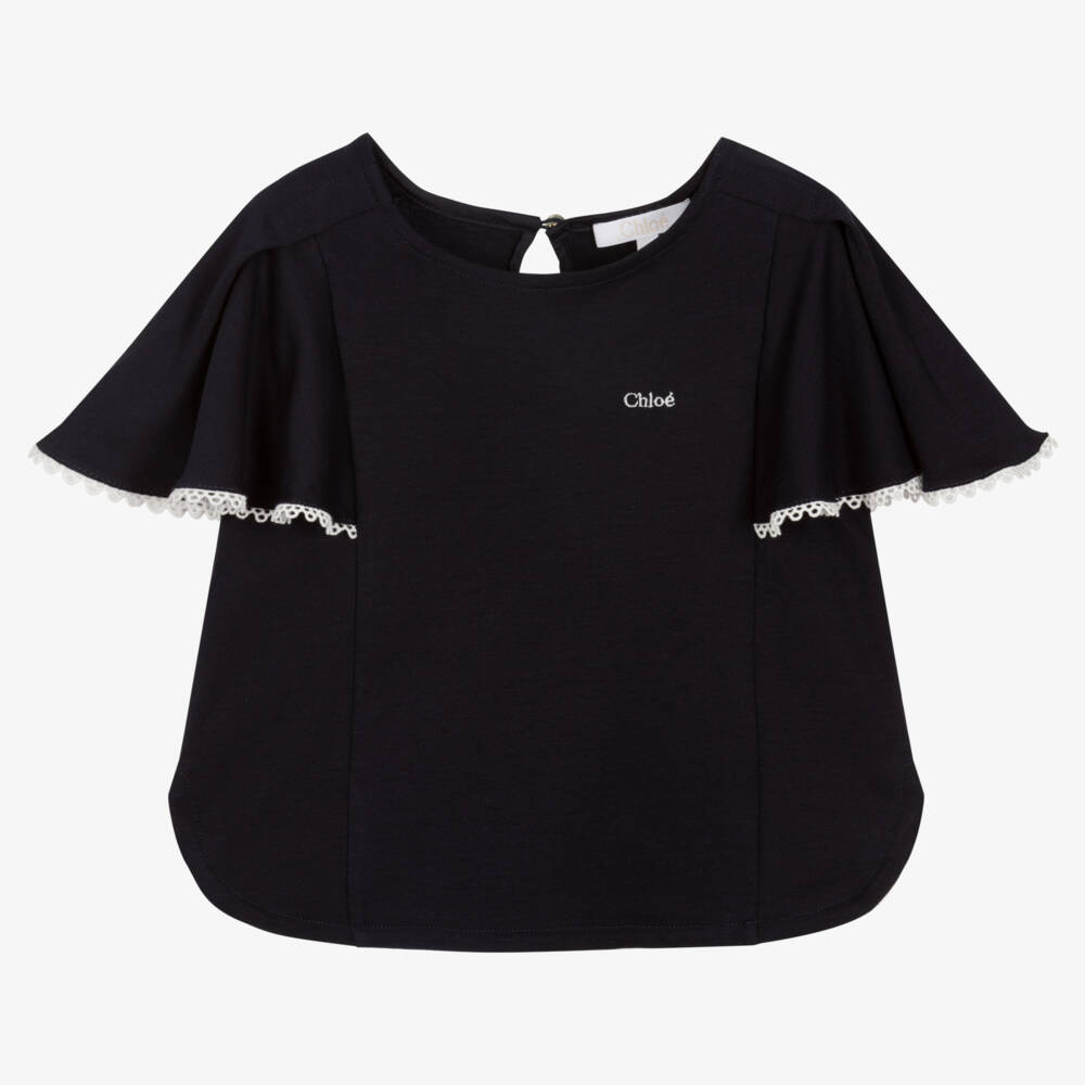 Pretty navy blue organic cotton top for girls by French brand Chloé, made in comfortable jersey with beautiful angel sleeves trimmed in delicate ivory guipure lace. There is a small logo embroidered in ivory on the chest and a branded gold tone button to fasten on the back for subtle brand recognition.