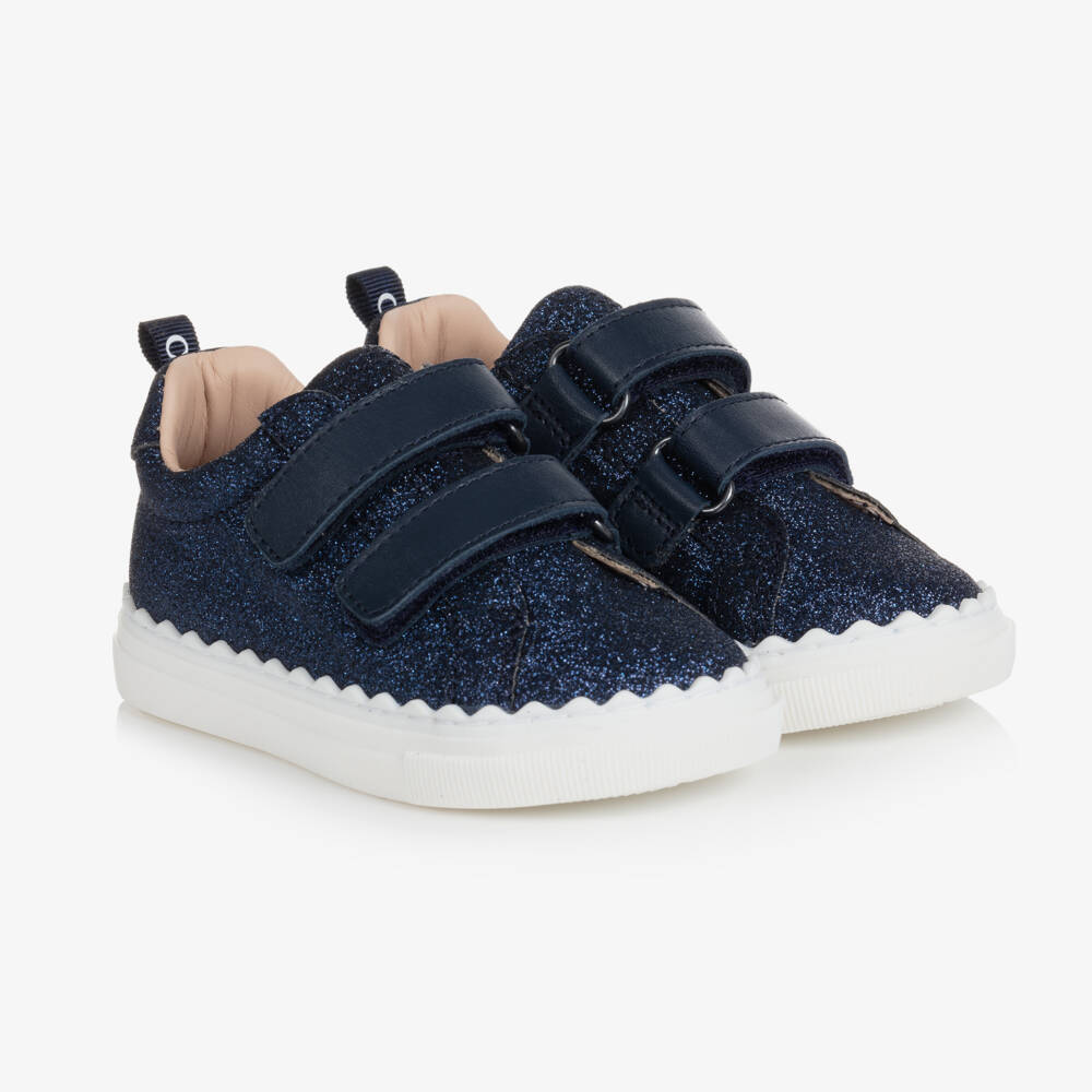 Glittery navy blue trainers for little girls by luxury French brand Chloé, made in soft leather coated with glitter. Made to stand out from the crowd, they are discreetly signed with a gold Chloé signature logo on the tongue and blue and white pull tab on the heel. Lined in soft leather, they have velcro-fastening straps across the foot for a secure fit and non-slip rubber outer soles.
