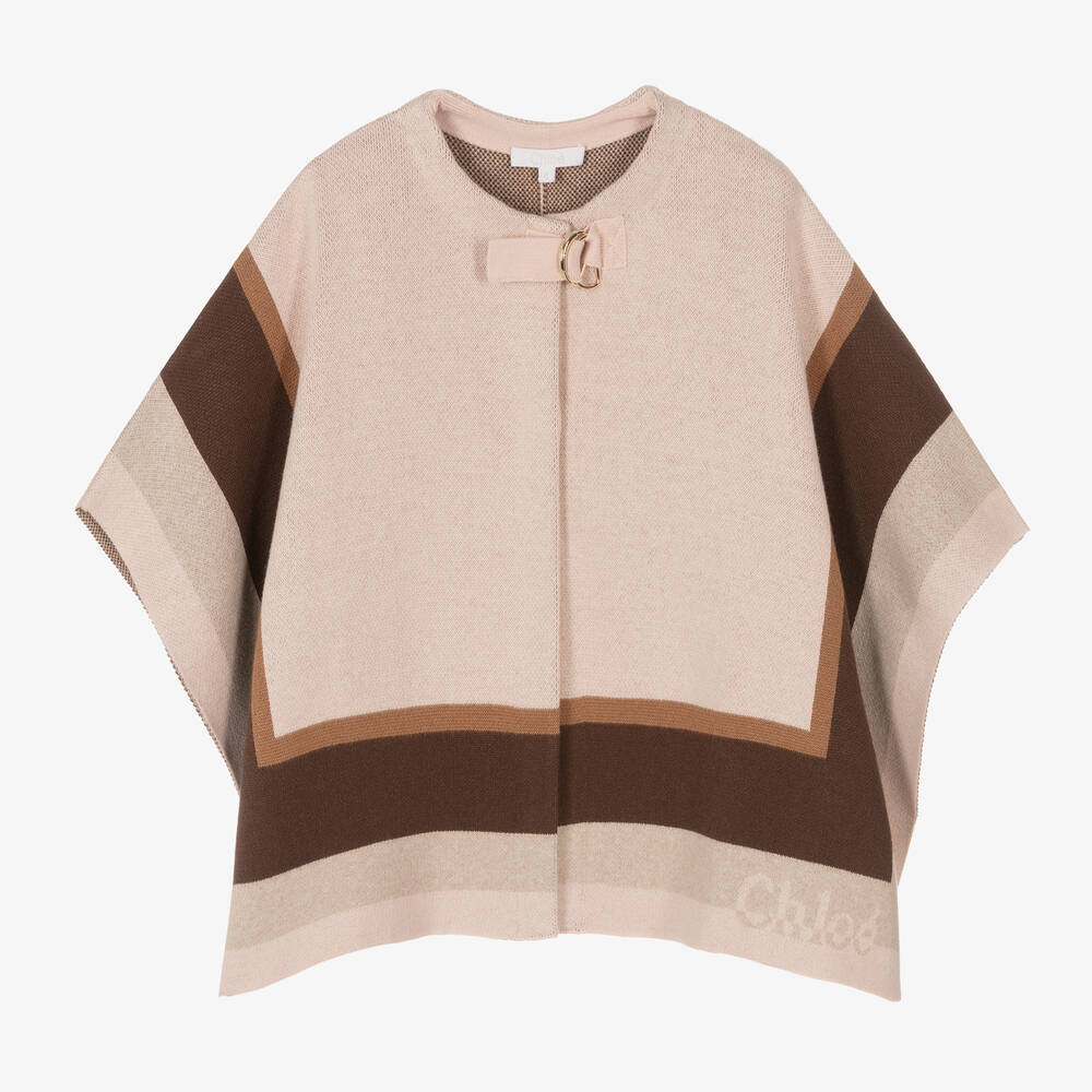 A stylish pale pink cape for girls by luxury French brand Chloé, knitted in the softest organic cotton and wool blend. Beautifully warm, it has a brown and beige striped design with an intarsia knit Chloé logo for a signature look. It fastens with concealed poppers and for a neat finish, and has a branded gold D-ring buckle on the neck.