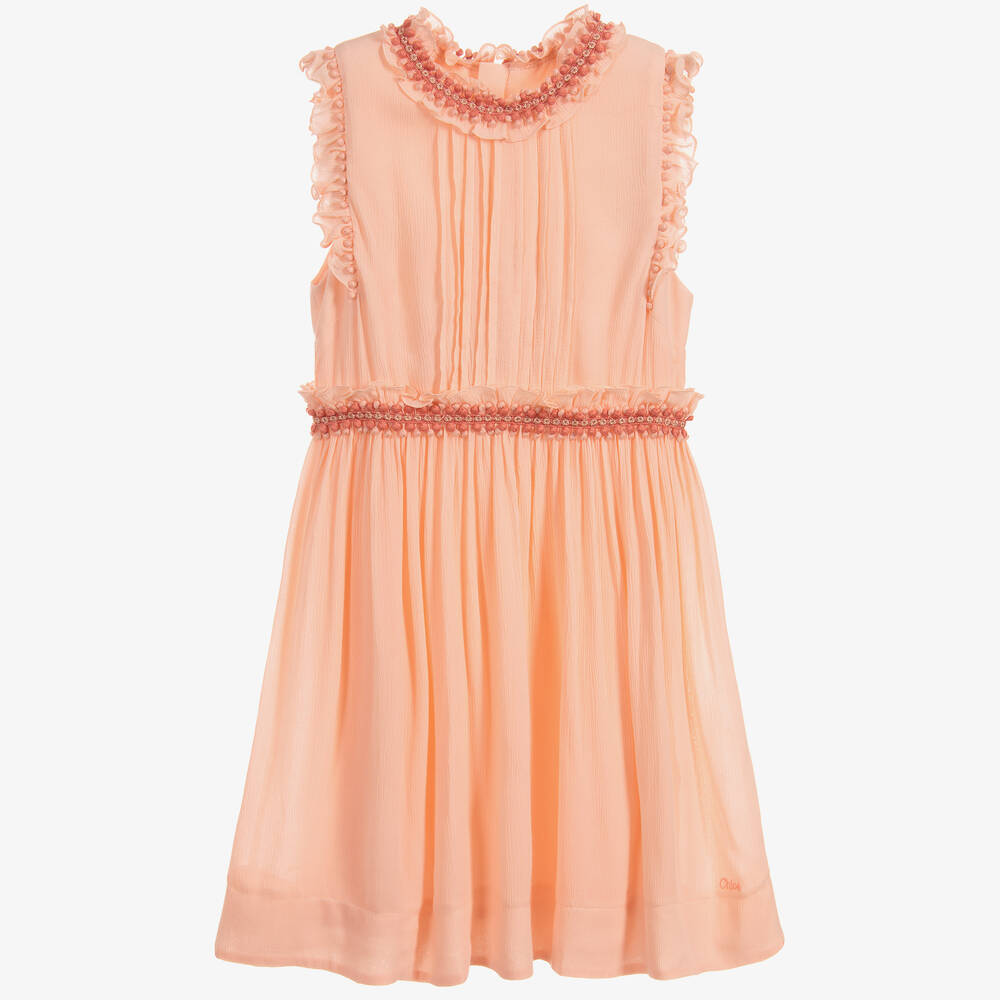A gorgeous peachy pink Mini-me dress from the girls couture Chloé collection. Made in lightweight viscose crêpe and fully lined, it has an embroidered logo on the hem. This pretty dress is trimmed with the designer's fancy embroidered braid.