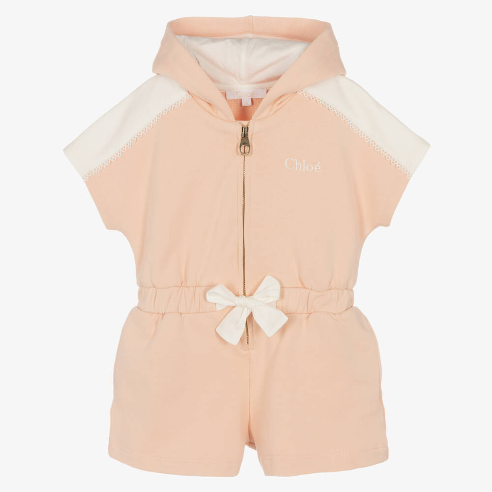 Lovely pale pink hooded playsuit for girls by luxury French brand Chloé. It has ivory shoulder panels with guipure lace trims and an embroidered logo on the chest. Zip-fastening with a gold-tone logo pull tab, the comfortable waist is elasticated and has ivory sashes that tie in a bow on the front. Comfortable and cosy, it is made in organic cotton sweatshirt jersey with a lined hood and concealed pockets on the side seams.