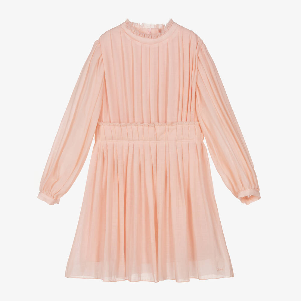 Smart pleated pink Mini-me dress for girls by luxury French designer Chloé, made in very lightweight wool with a subtle, embroidered logo by the hemline. It has a frilly, frayed, stand-up collar, a coordinating waistband and full, semi-sheer sleeves. Fully lined in lightweight twill for comfort, it has a neat, concealed zip fastening on the back.