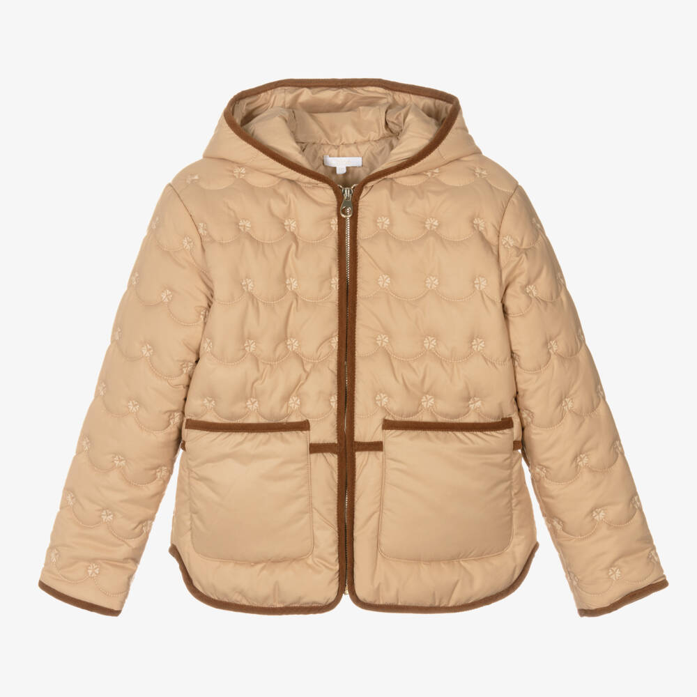 A beige padded jacket for teen girls by luxury brand Chloé, made and lined in silky-soft fabric. In the brand's signature understated style, the quilting is shaped in a scalloped design and detailed with tonal embroidered flowers. This hooded jacket has handy front patch pockets and a golden branded zip.