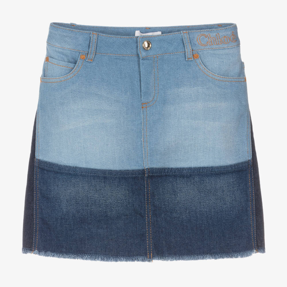 Blue denim jean-style skirt for teen girls by luxury French brand Chloé, with an orange embroidered logo on the waistband for a discreet designer statement. Inspired by the adult collection, it has panels on the front and back and inserts on the sides in different shades of blue. This casual skirt has classic five pocket styling and orange stitching. Made in a soft cotton blend, it fastens with a branded popper and zip on the front.