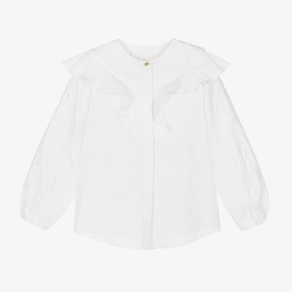 An ivory blouse for teen girls by French fashion house Chloé, a design inspired by the adult collection. In the brand's signature style, this smart top has elegant ruffles across the shoulder and puff-effect sleeves with delicate tonal flower embroidery. Fastening on the front, there are hidden pearlescent buttons, with one gold-tone branded button on the neckline. Comfortable to wear, it is woven in soft organic cotton twill. An ivory Chloé signature logo is embroidered on the front hem.