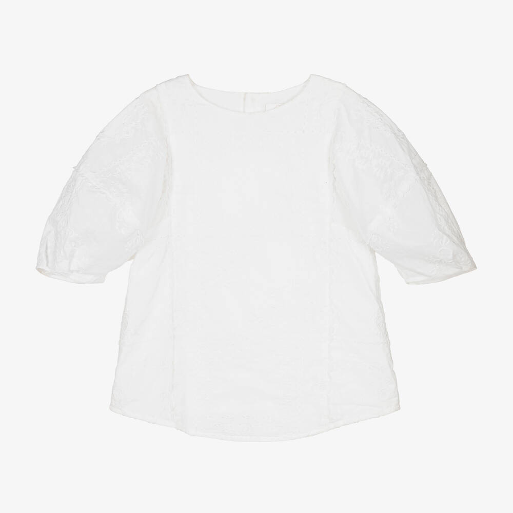 Teen girls lovely ivory Mini-me blouse by French brand Chloé, made in soft and delicate organic cotton voile. Entirely embroidered in a pretty squared pattern, the beautiful motif incorporates romantic florals, the Signature 'C' logo and scalloped borders. Partly lined for comfort, it is designed with sheer puffed sleeves and covered button fastening on the back. A little tonal Chloé logo is embroidered by the front hem for a lovely finishing touch.