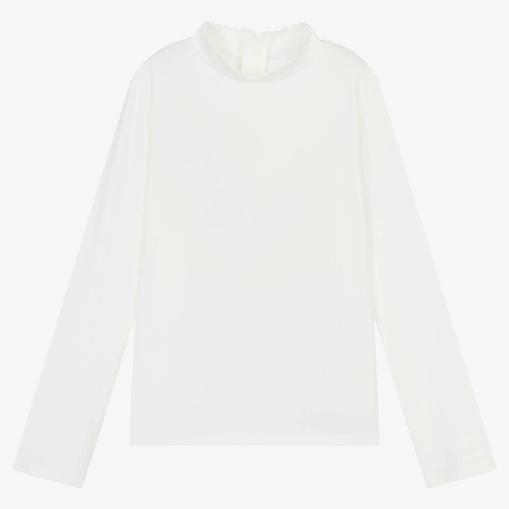 Lovely ivory organic cotton top for teen girls by luxury French brand Chloé, with the new flower logo embroidered on one cuff. A signature of the label, it has beautiful scalloped embroidery around the stand-up collar. It is made in super soft organic cotton jersey with a concealed zip fastening around the back for a seamless look.