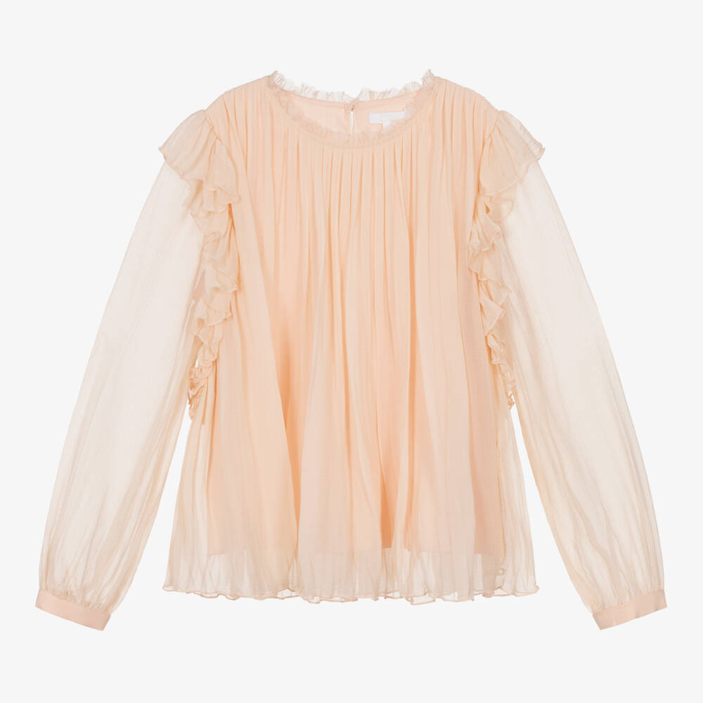 Gorgeous pale pink silk chiffon blouse by Chloé. Floaty and lightweight, this elegant pleated blouse has delicate frills and a subtly embroidered Chloé logo near the hemline. Lined in breathable smooth cotton, there is a keyhole button fastening at the back.