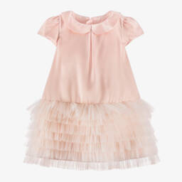 Lovely pastel pink, blue and yellow dress for girls from Coeur by Childrensalon, made in layers of rainbow-coloured tulle. Ideal for a special event, it has large, dramatic angel sleeves and a full, gathered skirt with a glittery gold waistband. It is lined in soft voile for comfort and has a neat, concealed zip fastening around the back.