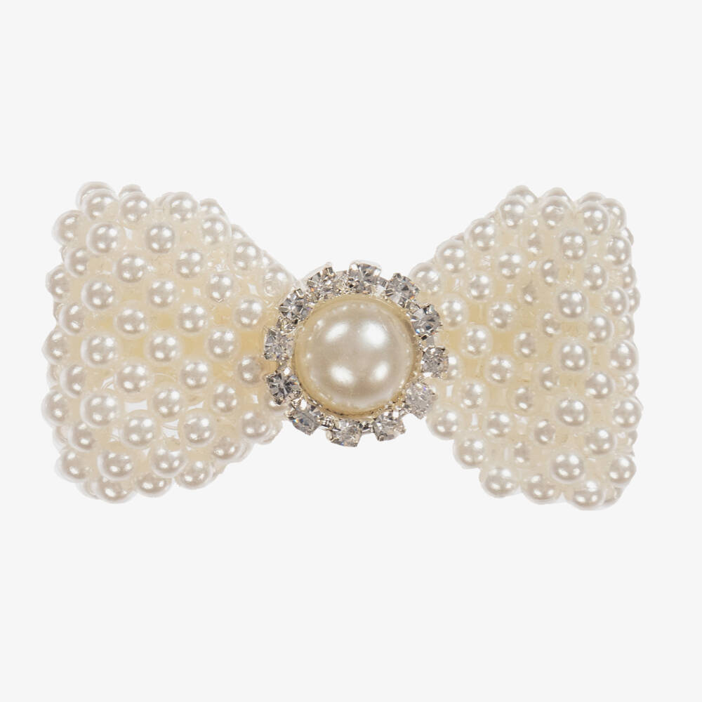 A gorgeous, ivory elasticated bracelet for girls by Cute Cute. This handmade bracelet has a pearl and sparkling diamanté bow.