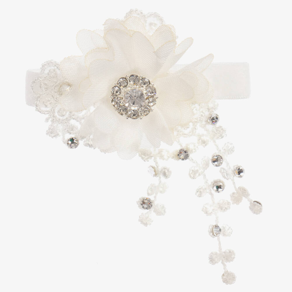 A gorgeous, ivory elasticated bracelet for girls by Cute Cute. This handmade bracelet has a white lace and palest ivory chiffon floral decoration with sparkling Swarovski crystals.